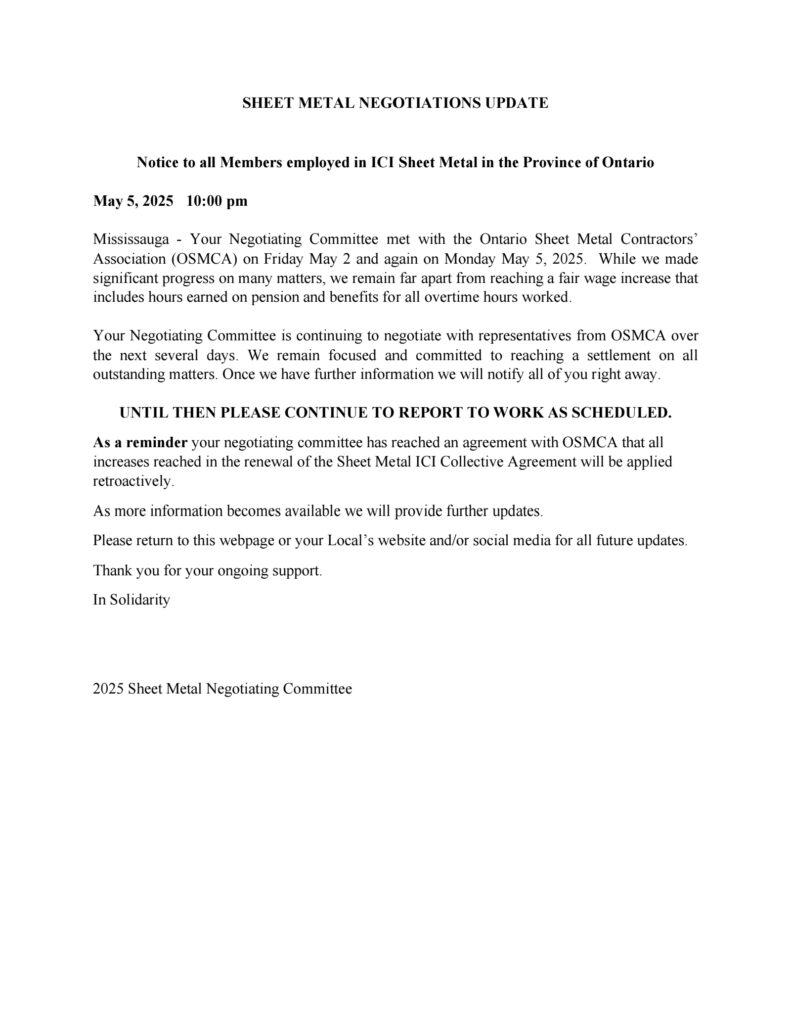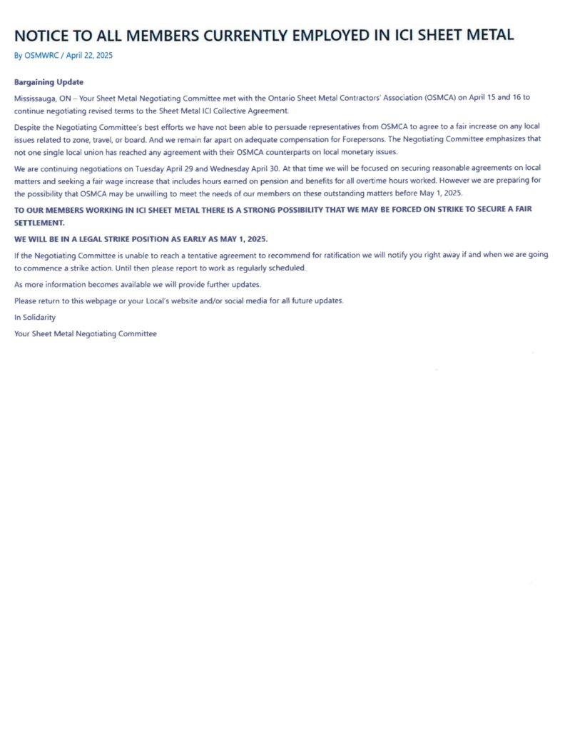 UPDATE APRIL 30: NOTICE TO ALL MEMBERS CURRENTLY EMPLOYED IN ICI SHEET METAL