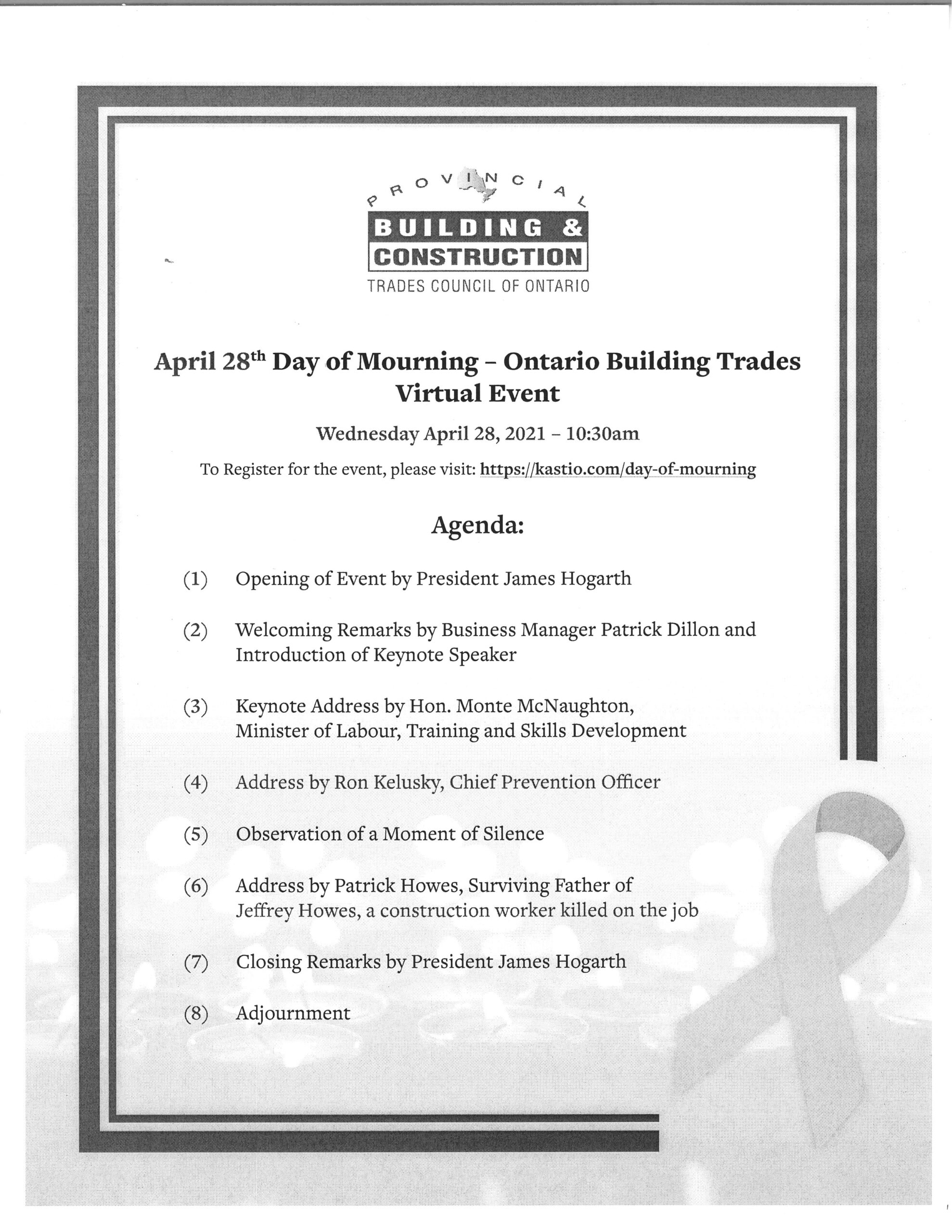 This is a friendly reminder that our Provincial Council will be hosting a Virtual Event to mark this year’s April 28th National Day of Mourning which will feature the Honourable Monte McNaughton, Minister of Labour, Training and Skills Development as the Keynote Speaker. The Day of Mourning is a nationally-recognized day to honour all workers who have lost their lives as a result of a workplace incident or occupational disease.