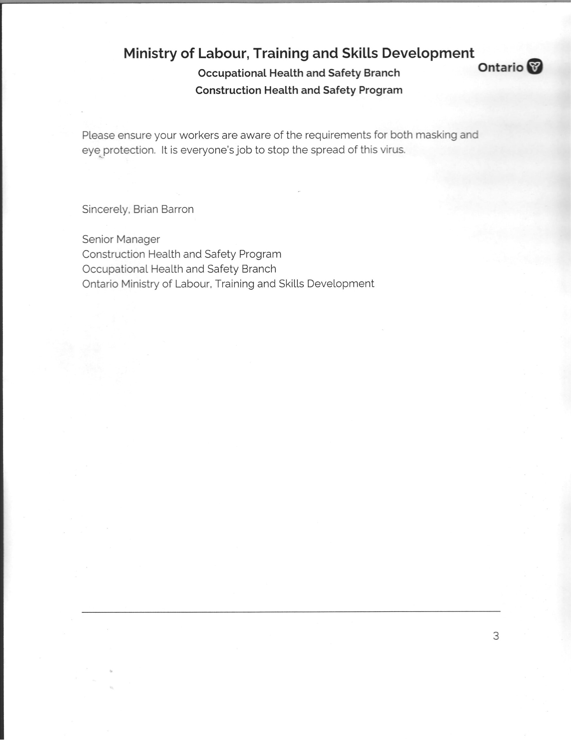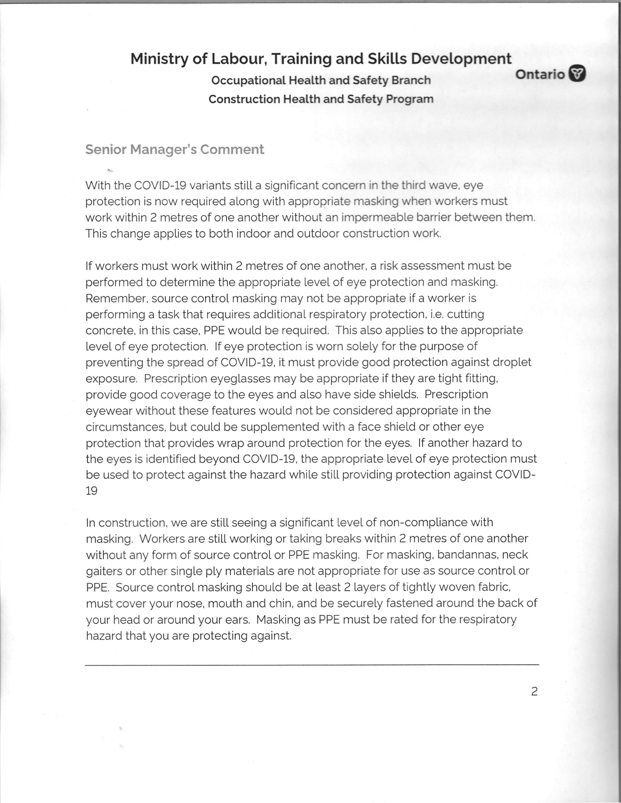We are attaching a document from the Ministry of Labour, Training and Skills Development (MLTSD) in regards to masking and eye wear if workers must work within two meters of one another.